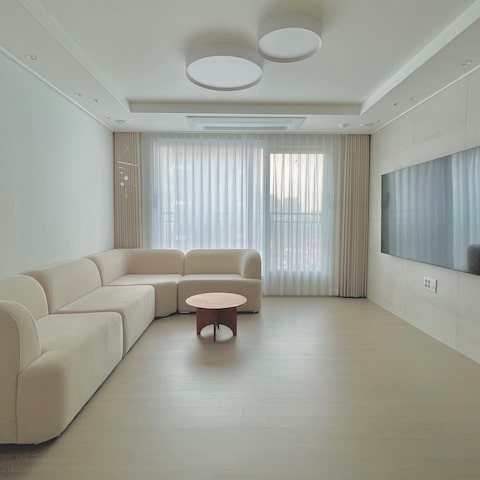 두꺼운 속지가 선택된 월베아이파크 거실 모습입니다 깔끔하게 인테리어 된 공간에 베이지 소파와 함께 매칭된 아이보리색 커튼입니다